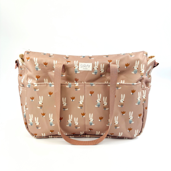 Bolso ideal para el día a día. Cuenta con 2 asas para el hombre y 2 ganchos para colgar al coche. Tiene 2 bolsillos externo y 1 bolsillo interno. Asimismo, cuenta con 2 bolsillos en los costados para tener a la mano el biberón o el toma todo.